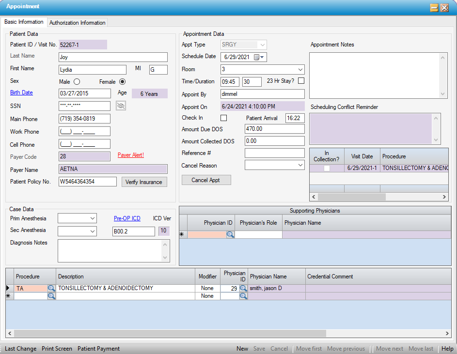 This screen is accessed from the Appointment Sheet by double-clicking on an existing appointment, which opens the screen with the patient's details,