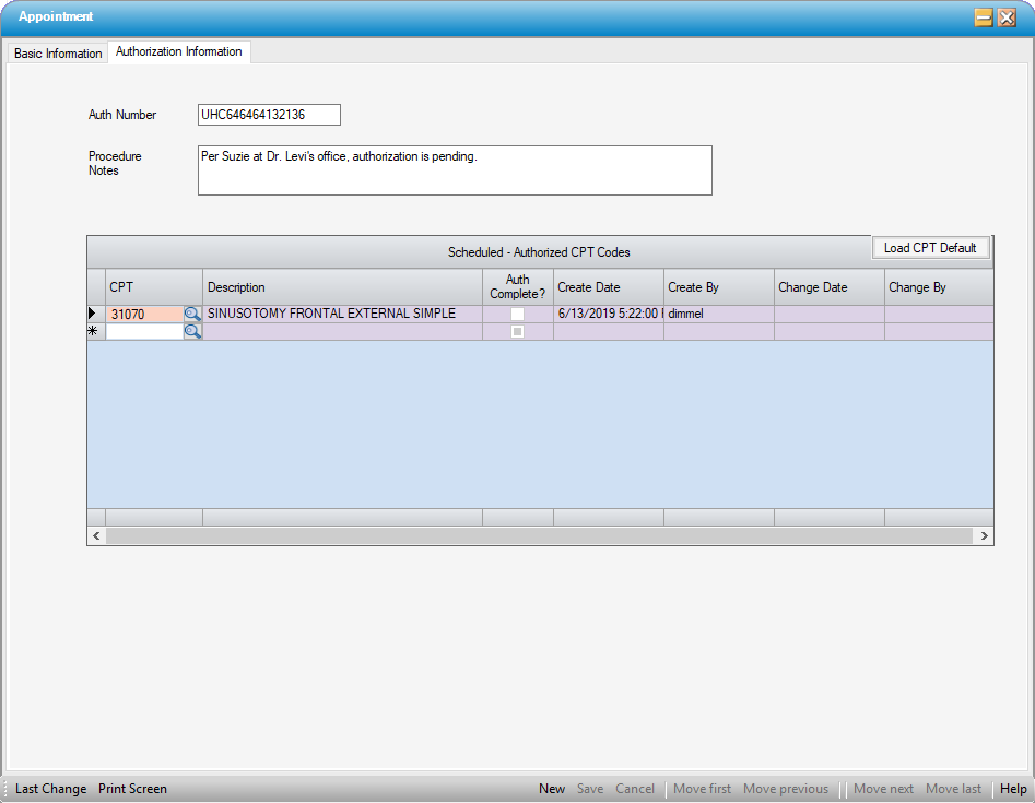 Enter the requested or authorized codes in the Scheduled-Authorized CPT Codes grid. Codes can be entered by selecting