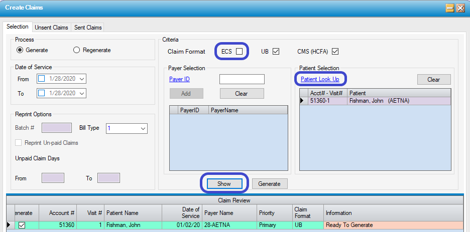 • By default ECS, UB, and CMS are all checked, which will generate all eligible claims. To generate claims for only specific formats, uncheck the boxes which do not apply.