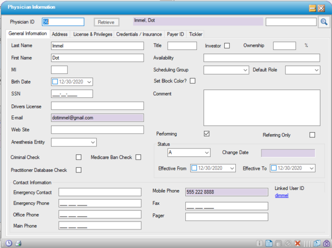 | Linked User ID | This section to the right will display when there are liked User Profiles associated to this Physician record. |