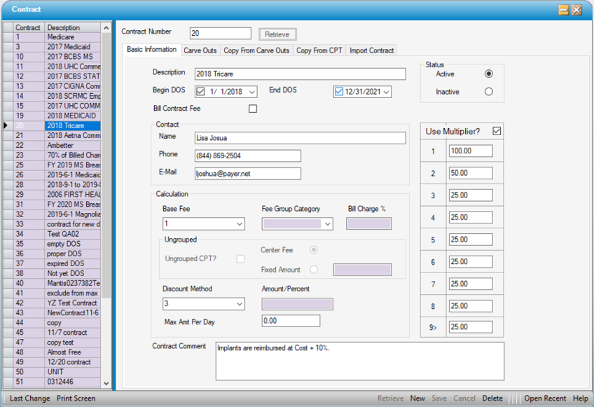The Basic Information tab of the Contract form establishes the basic Contract Information such as effective dates of service, contact information, how rates will be calculated, and whether multipliers will apply. Contract Alerts that will appear in Charge Entry will also be entered on this form.