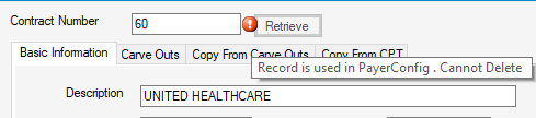 NOTE: Contracts cannot be deleted if they have been mapped to Payers that have been attached to cases. An error ball will appear with a hover message indicating why the contract cannot be deleted. Contracts that have been used should be Inactivated.