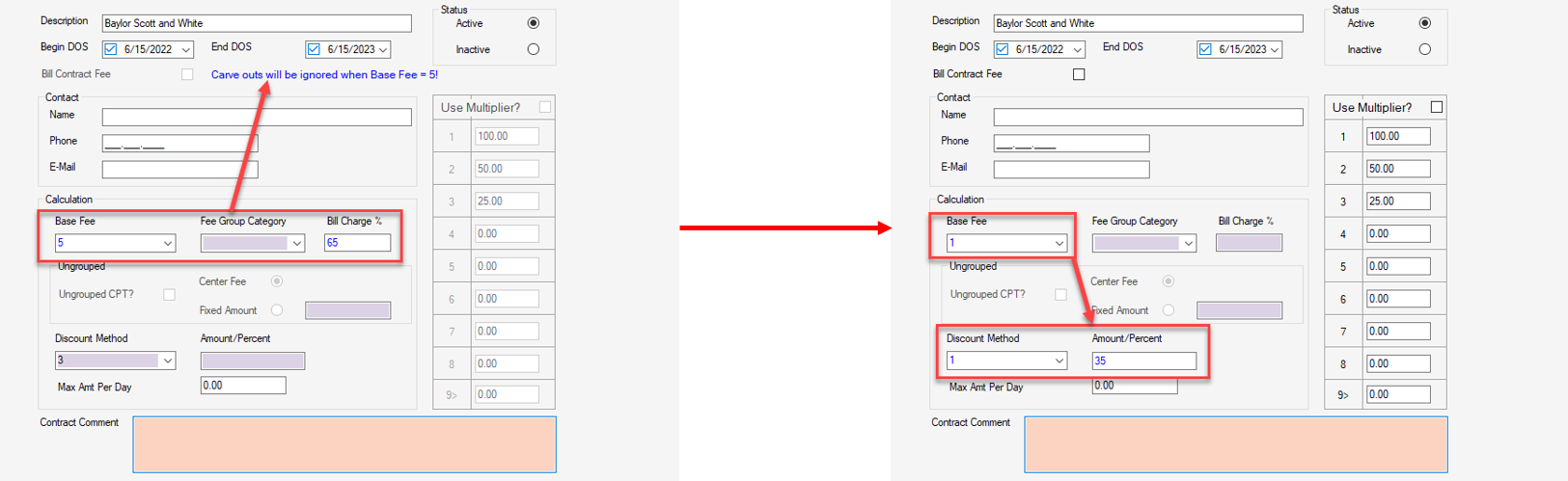 NOTE: When 5 - % of Billed Charges is utilized, Carve Outs will be ignored. Consequently, if a contract pays a % of billed charges but also has Carve Outs, the best way to set it up is by using 1 - Center Fee as the Base Fee, and 1 - Discount Fee by percentage as the discount method, and then discounting the fee down to the percentage which is the contracted rate.
