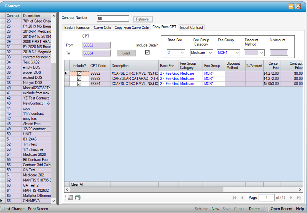Centers can copy the carve outs into current Contract from the CPT Code tables in groups or individually.