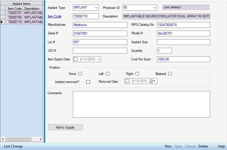 to add to Supply Used tab. (Add to Supply function will not be available for selection if implant was entered without an Item Code.) - This information is displayed on reports:CL2003 – Implant Log and CL2006 – Infection Control.