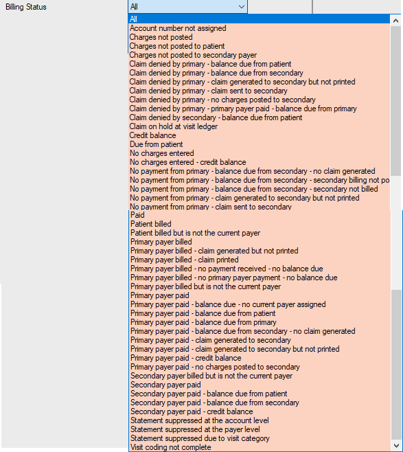 Tracks the billing status of all patients seen within the specified date of service range.