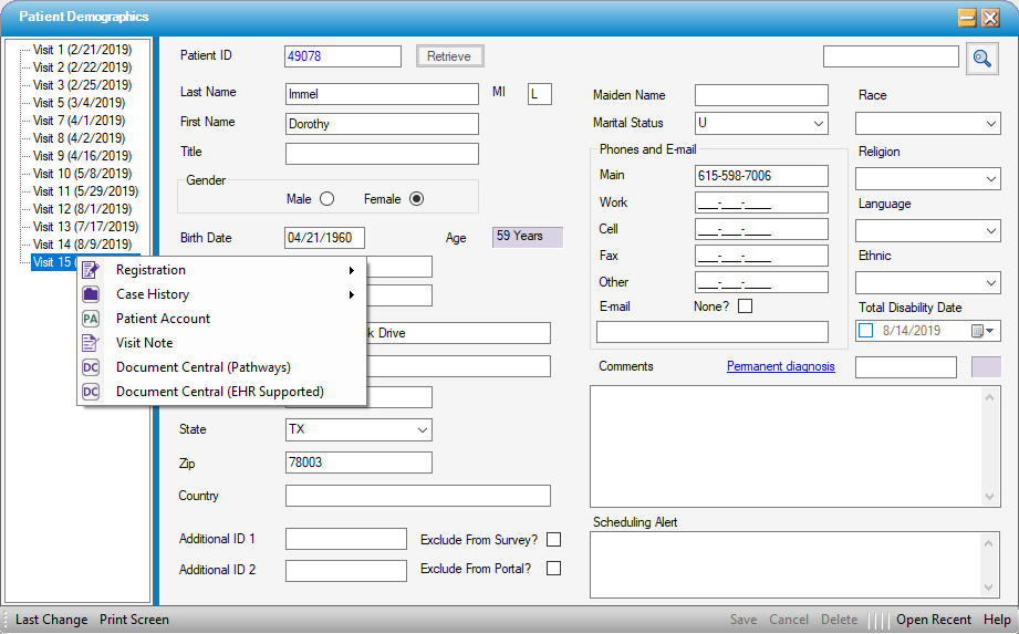This form is used to view, update, or delete basic patient demographics and displays all patient visits in the tree view on the left.  Click https://demo.hstpathways.com/HstAscWebServiceWCF/Help/Images/Save.jpgSave if any updates are made in this form.