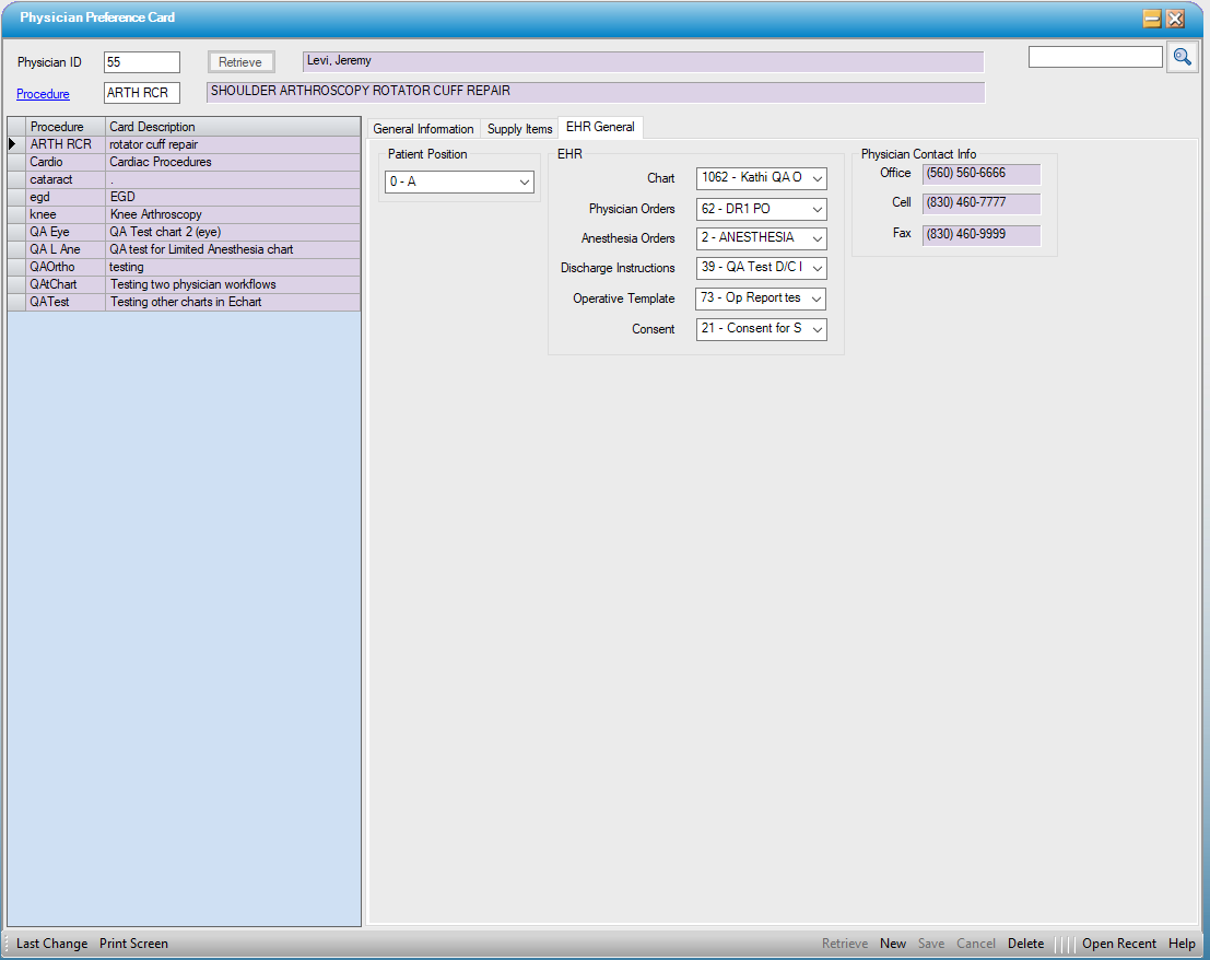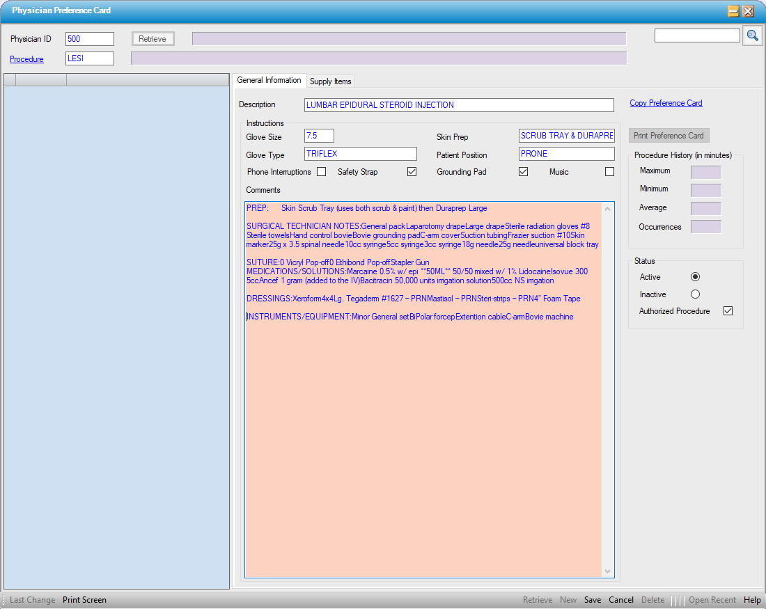 - Enter information for the Preference Card on the General Information tab. These items are related to physician preferences as well as room and patient preparation.