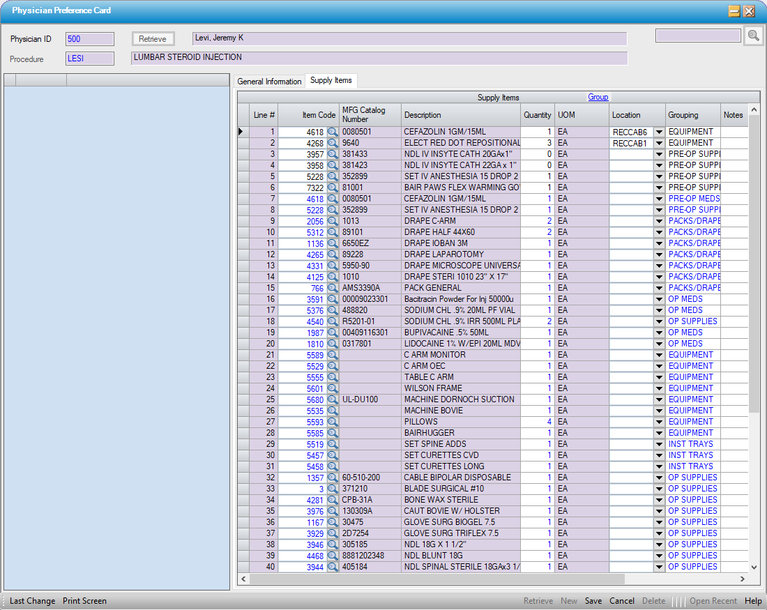 - Select the Locationand Grouping from the drop down. Inventory Location and Physician Pref Card Group are both found under Center Tables in Administration > Code Table Maintenance. These tables are built and maintained by the center. Preference Cards can be printed by Item Location or Pref Card Group for ease of pulling supplies. Supply Used can be grouped if staff is responsible for updating supplies used in specific departments/areas.