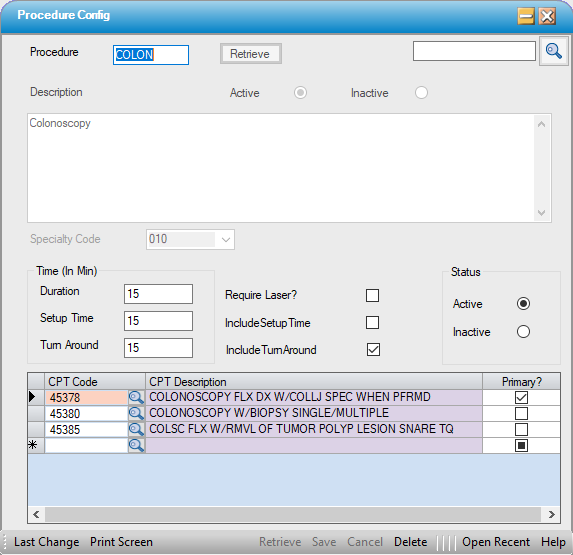 • The most commonly used CPT Codes can be mapped to a Procedure by entering them on the grid in Procedure Configuration. CPT Codes entered here will allow users to search by CPT Code when scheduling a Procedure, Load CPT Default on Insurance Authorization tabs and in the Patient Estimator, and will be available for selection in Charge Entry.