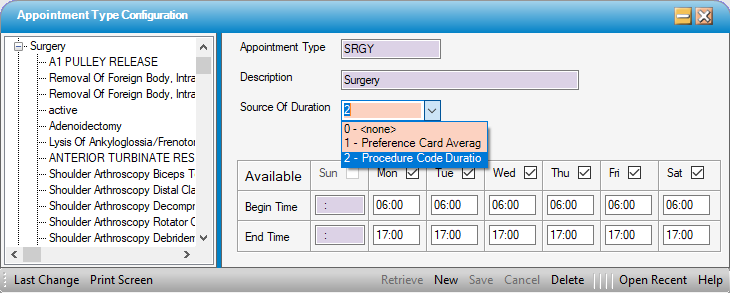 • If the Source of Duration in Scheduling > Appointment Type Configuration is set to 2 - Procedure Code Duration, then those times (in Minutes) are entered as Duration. Setup Time and Turn Around time can also be entered. If the box(s) are checked to include these times, then when a case is booked using the Procedure entered, the duration will include the time entered in each of these fields.
