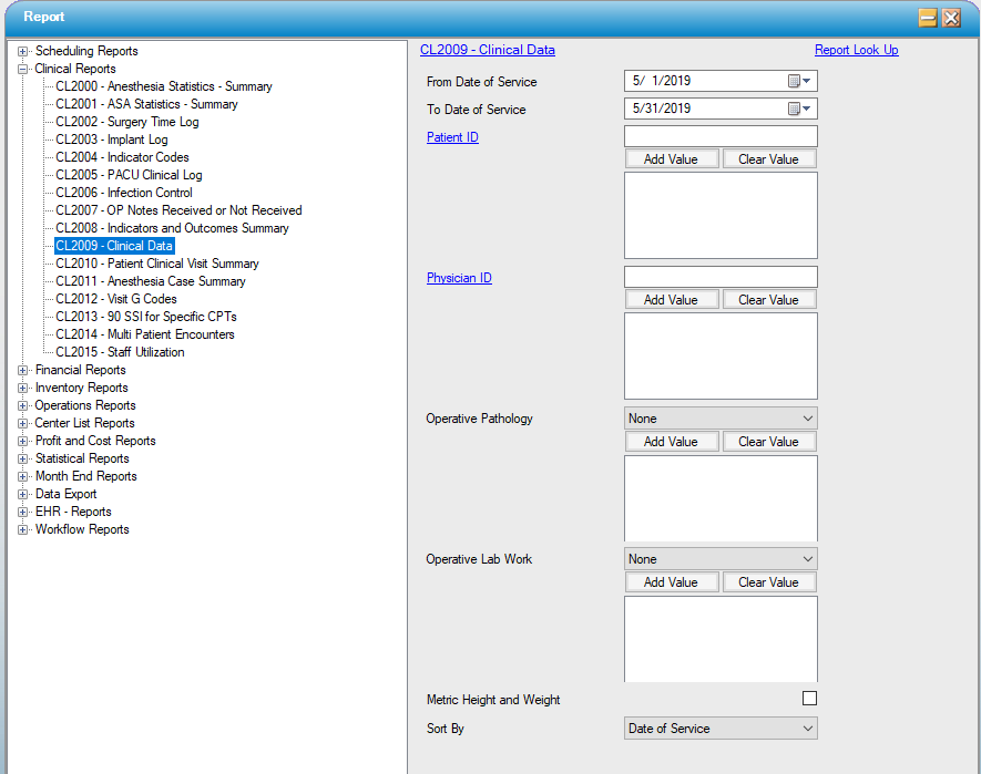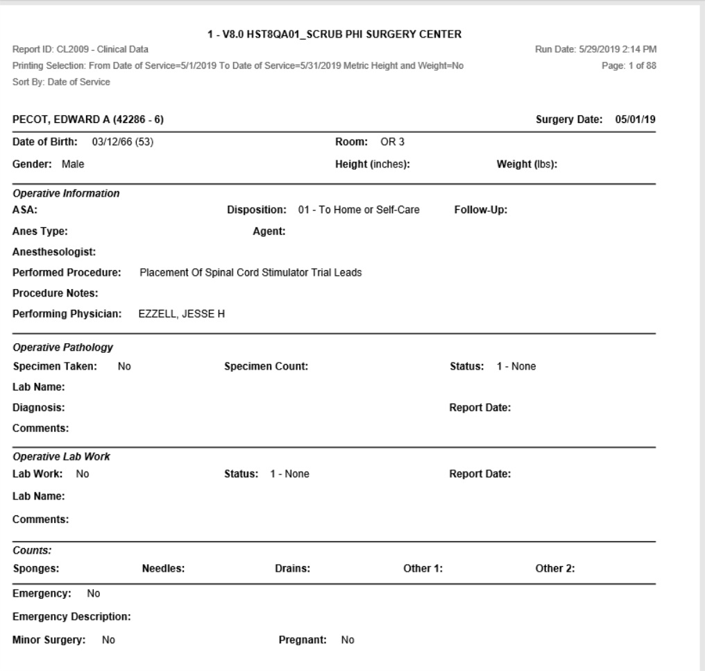 This report may be used to follow up on Operative Pathology and Lab work. Filter by the status values for each (None, Sent, Follow Up, Received).