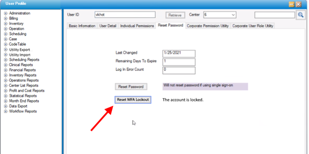 7. A message will appear to the right, after clicking the Reset MFA Lockout button. Account has been reset.