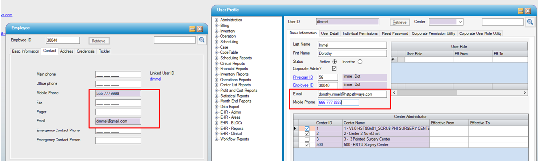 Every user that logs in needs a User Profile, but not every user has an Employee Record or a linked Physician record. This makes the User Profile the source of truth for Authentication purposes. To assist with keeping linked Employees and Physicians Email and Mobile Phones up to date, when there is a Physician or Employee linked to a User Profile, the Email and Mobile Phone fields are Read Only in the Physician and Employee records and must be updated via the User Profile.
