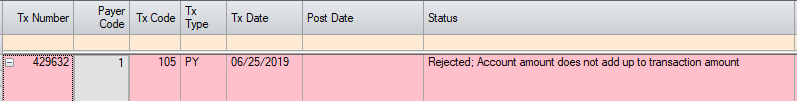 • Rejected transactions are pink, and the Status column will provide the reason for the rejection: