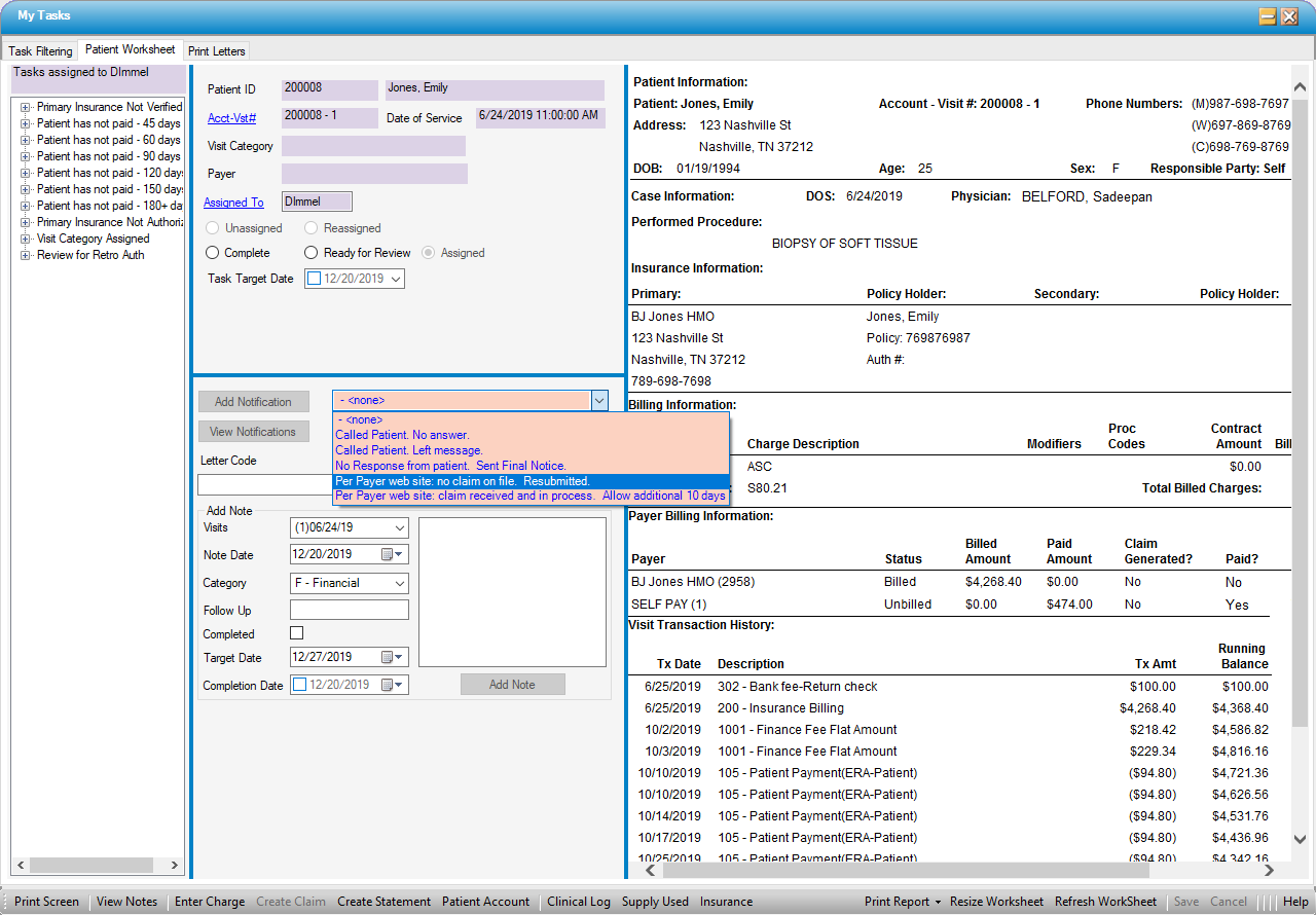 Primary payer billed – no payment received – no balance due. If a primary payer was billed, but the balance is $0.00 due to patient payment at time of service, and primary insurance payment has not been received, a task will generate. Once a Primary payment has been posted – even if that payment is $0.00 – the task will auto close.