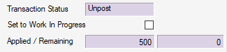 function key to enter the next Account Number, Visit, and Applied Amount. Status will be set to Work In Progress until total Applied Amounts = the Transaction Amount, at which time the transaction can be saved and posted. -