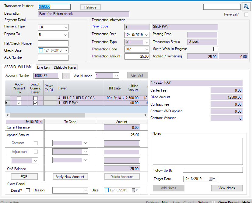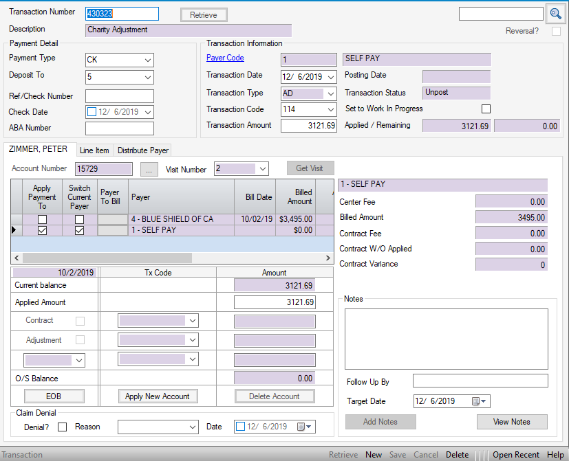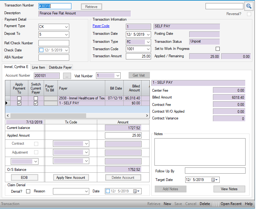 Examples of Finance Charges may include interest or late payment penalties. These can be applied utilizingBulk Self Pay Transactions or individually in the Payments And Adjustments form.