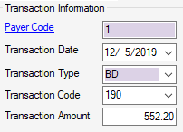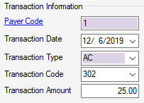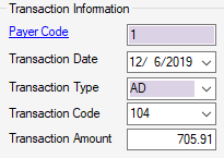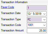 - Transaction Code will populate based upon the default Finance Charge code entered in Payer Configuration for the Payer Code 1 or the payer selected. If no default transaction codes were entered in Payer Configuration, or a different code is required, enter manually or select from the drop down.