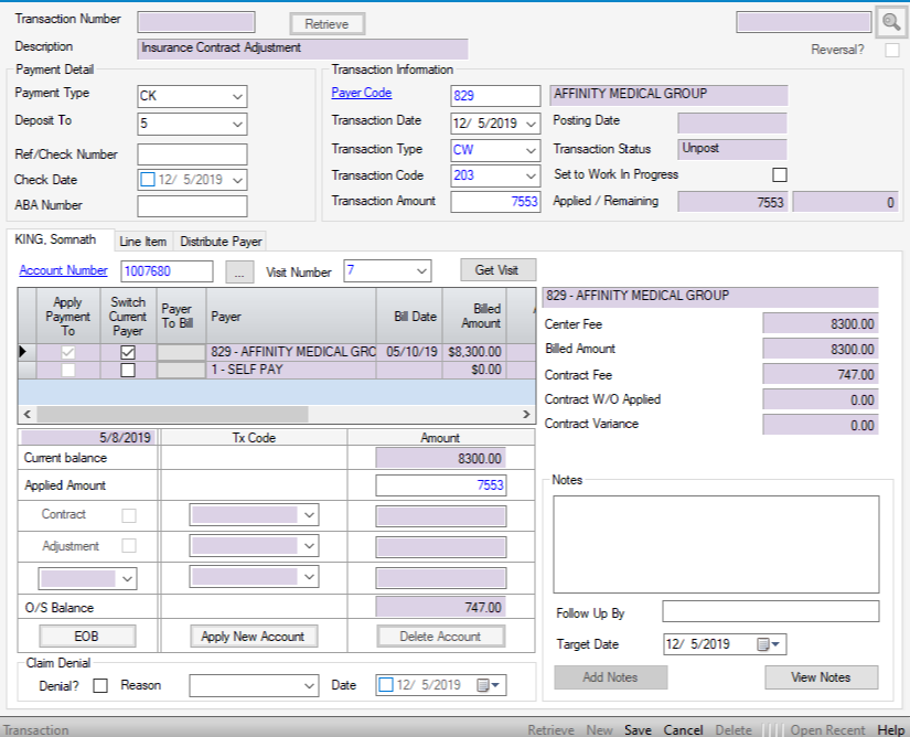 - If contract write-offs have been previously applied, the amount will default to the difference between Billed Amount minus Contract Fee and what has previously been applied.